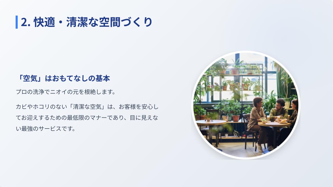 お客さまや大切なご家族、ペットが心身ともに気持ち良くお過ごしいただけるよう、お掃除を通じて少しでもお役に立てれば嬉しく思います。