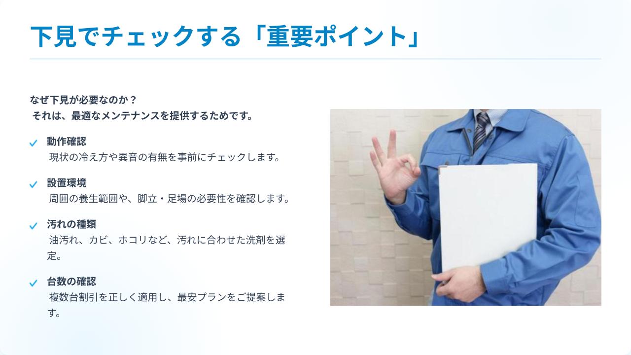 ●エアコンと壁の間が狭くて部品が外せない、動作確認で異音や故障している等の不具合が見受けられた際には作業を承れないことがございます。